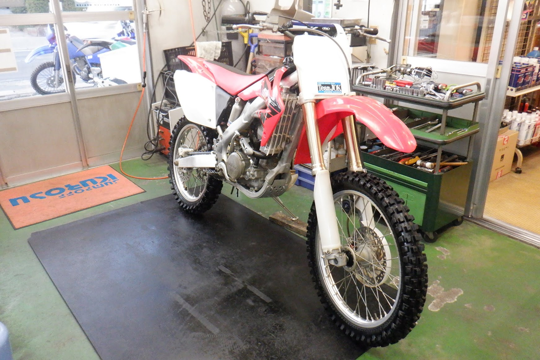 | ■ 車両状態 | 4スト250ccエンデューロ競技専用バイクです。 公道走行は出来ません。 個人的主観では有りますが程度は非常に良いと思います。ただし、左側ラジエーターが少々曲がっております。水漏れなどは無く使用に関して問題は有りません。 ほぼノーマル状態で使用頻度も少ないバイクです。 中古車としての点検整備個所は、スパークプラグ交換 エンジンオイル交換 エアーエレメント清掃 左右グリップラバー交換などです。 前後タイヤは前後共8分山程度です。 前後ブレーキパッドの残りは前3mm、後ろ4mm程度です。 車体の詳しい画像はこちらを参考にしてください。 |